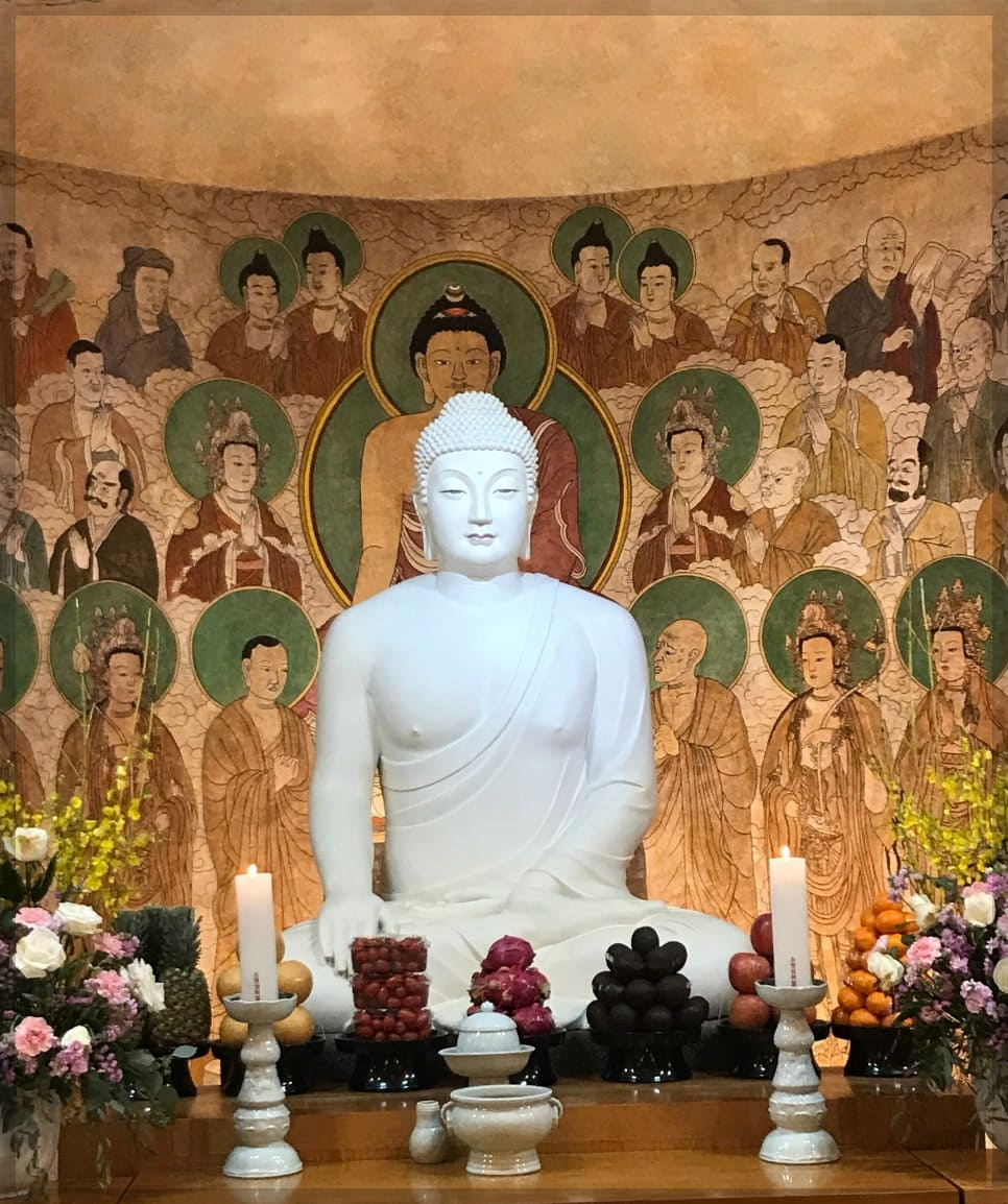 석가모니불은 석굴암 같은 반원형으로 둘러친 공간 앞에 앉아있습니다.