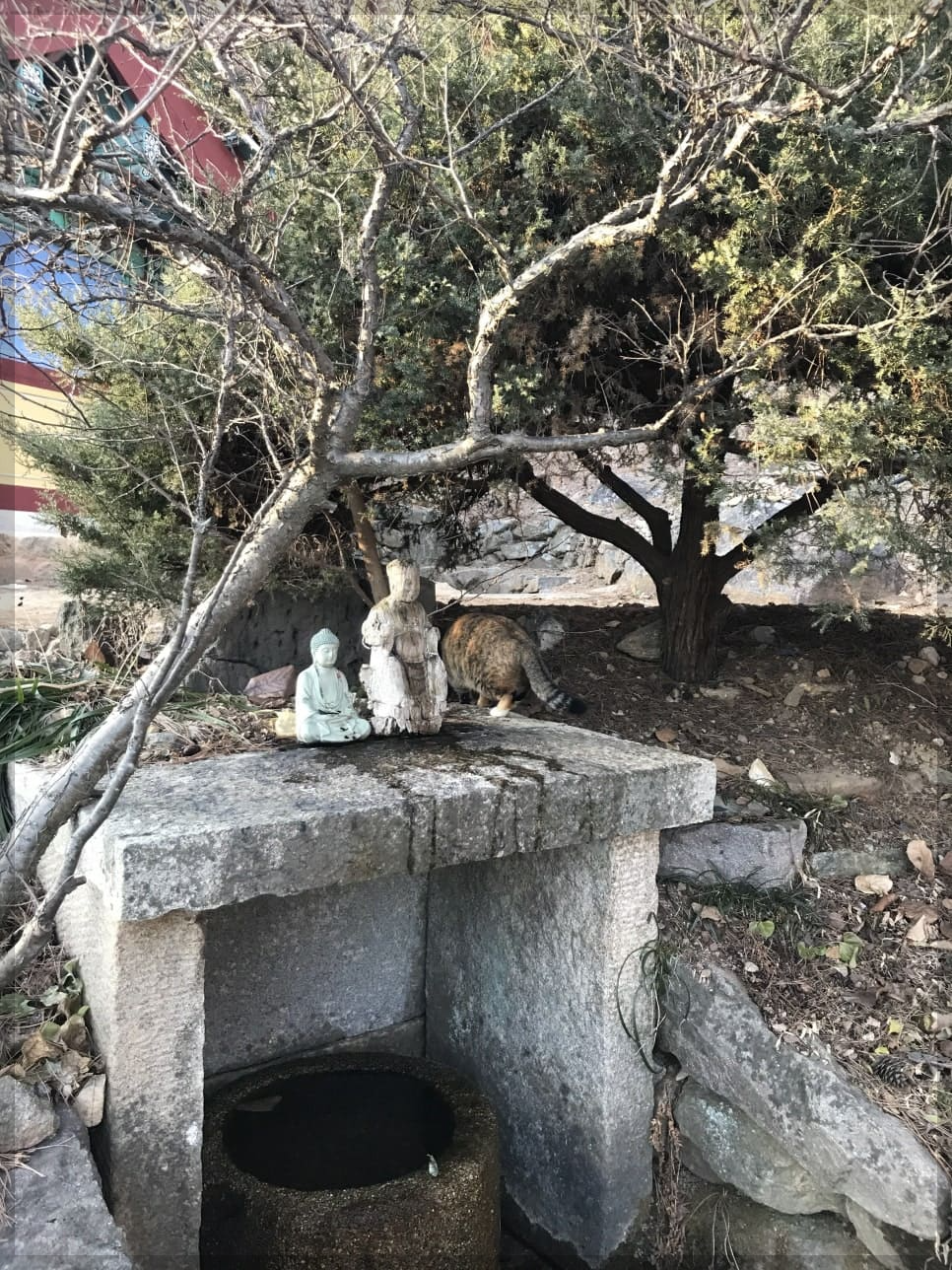 굴뚝 형상을 한 소각로 앞 연화 좌대 위에 석조 지장보살이 모셔져 있습니다. 49재 때 망자의 옷을 태우는 명부전 바로 앞에 있는 소대(燒臺)가 관광객들에게 미관상 좋지 않아 이곳으로 옮긴 것으로 보입니다.