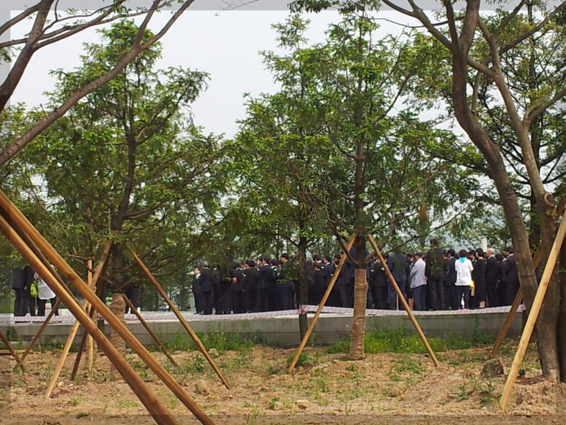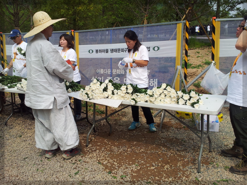 행사장 가장자리 탁자 위의 국화꽃송이는 행사를 마친 내빈들이 묘역으로 이동하여