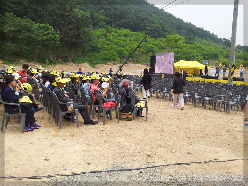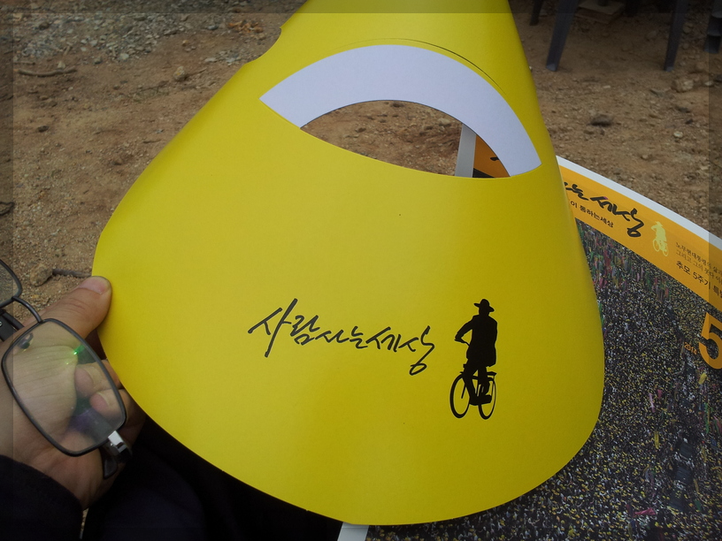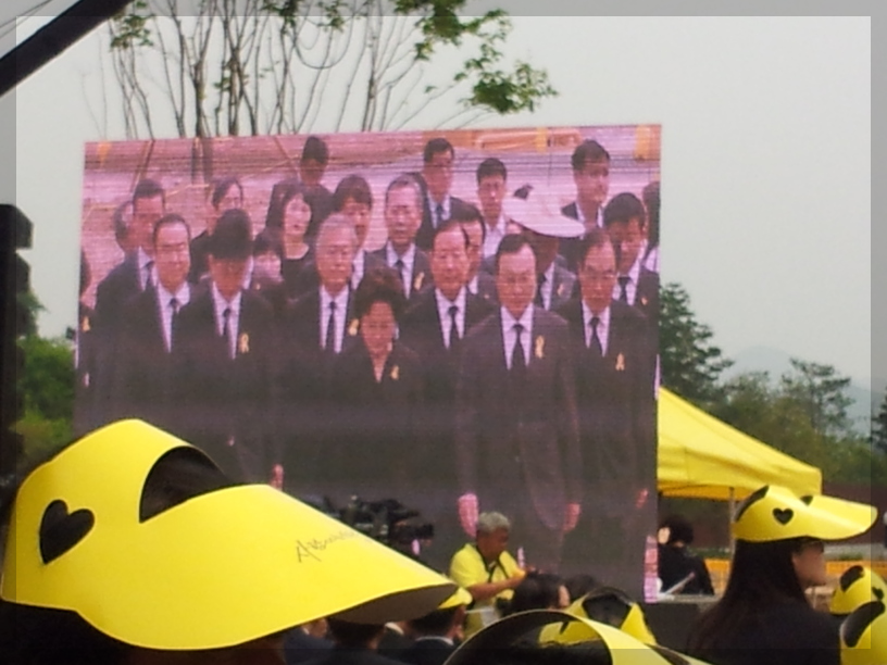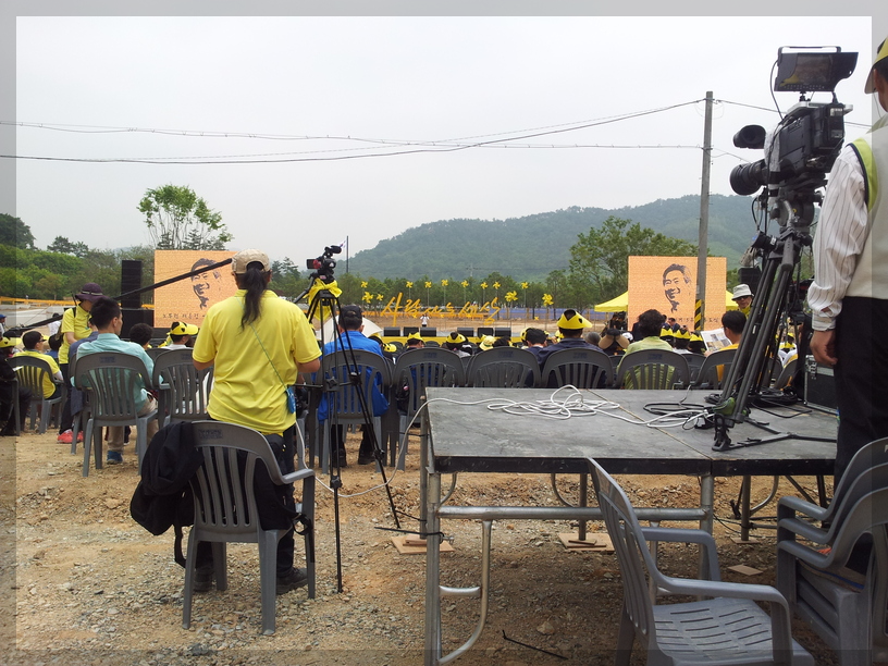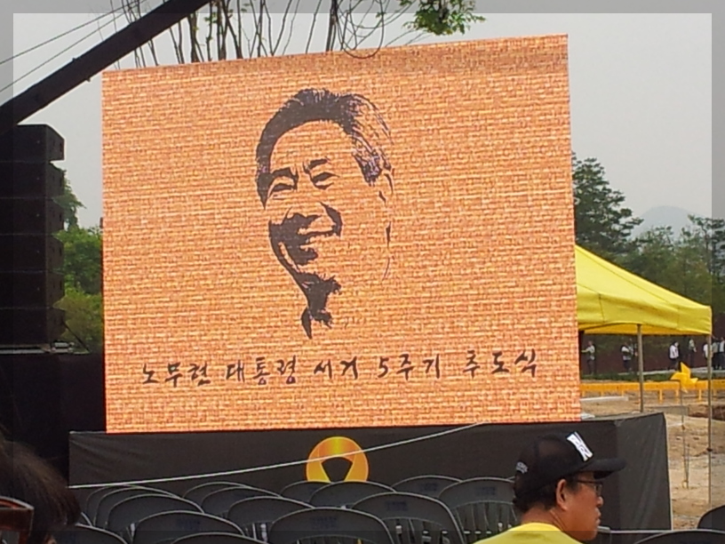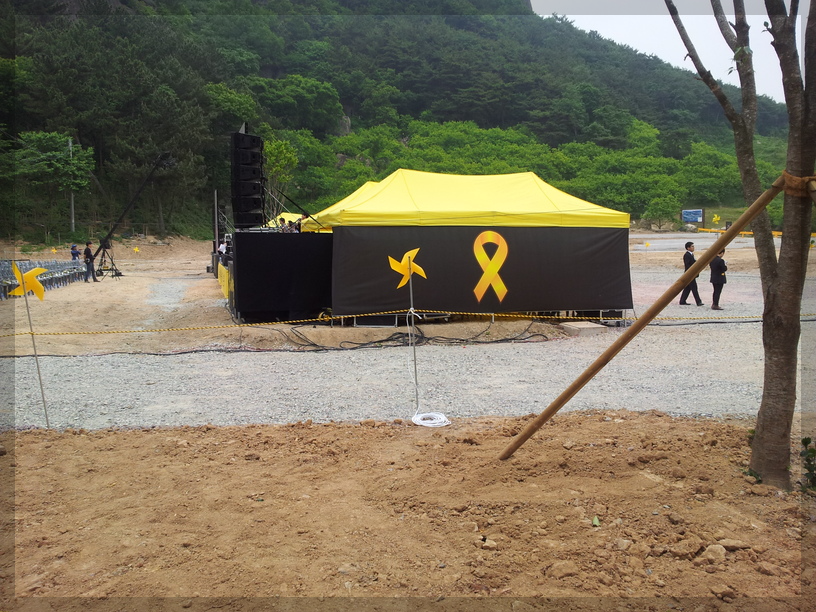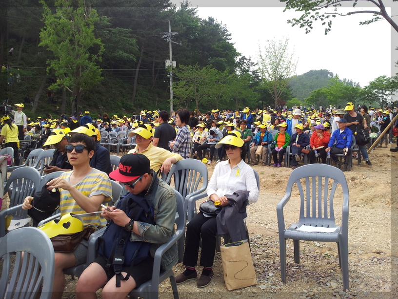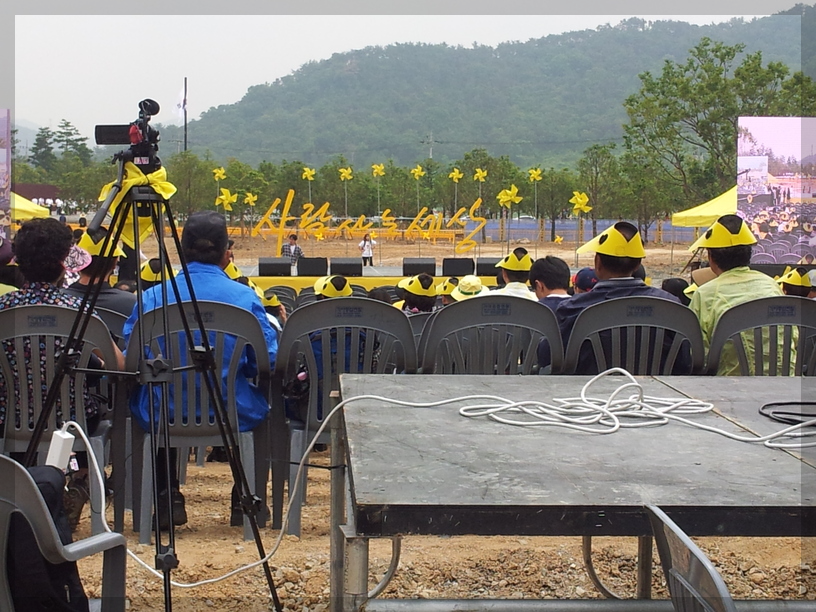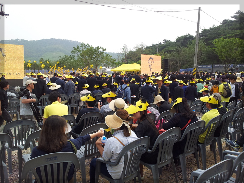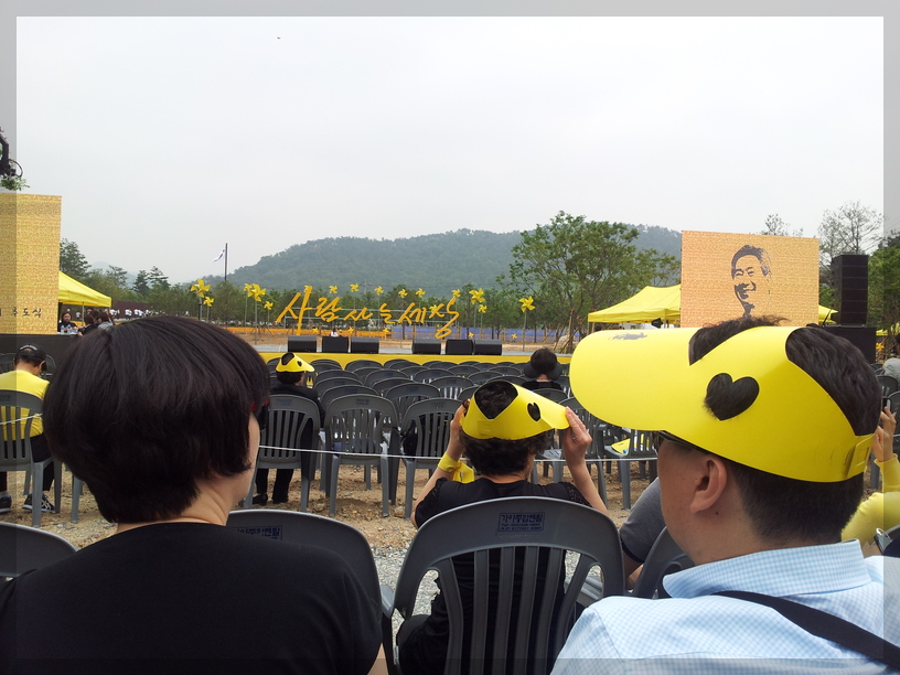 노랑리본이 눈에 띄는데... 저 노랑리본을 보면 세월호가 떠오릅니다. 세월호 사건은 2014년 4월 16일에 일어난 참사입니다. 그럼 노통 추도식이 열리던 5월 23일로부터 약 한 달 전에 일어났던 참사였네요. 그래서 저 노랑리본이 커다랗게 달려있는 듯합니다.