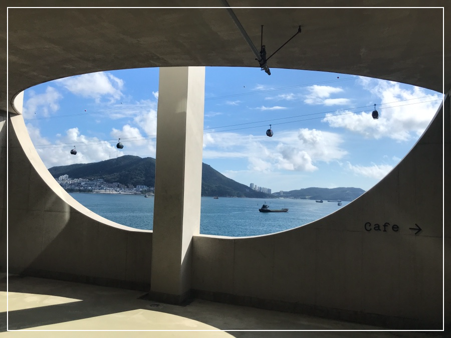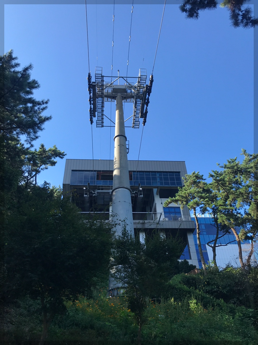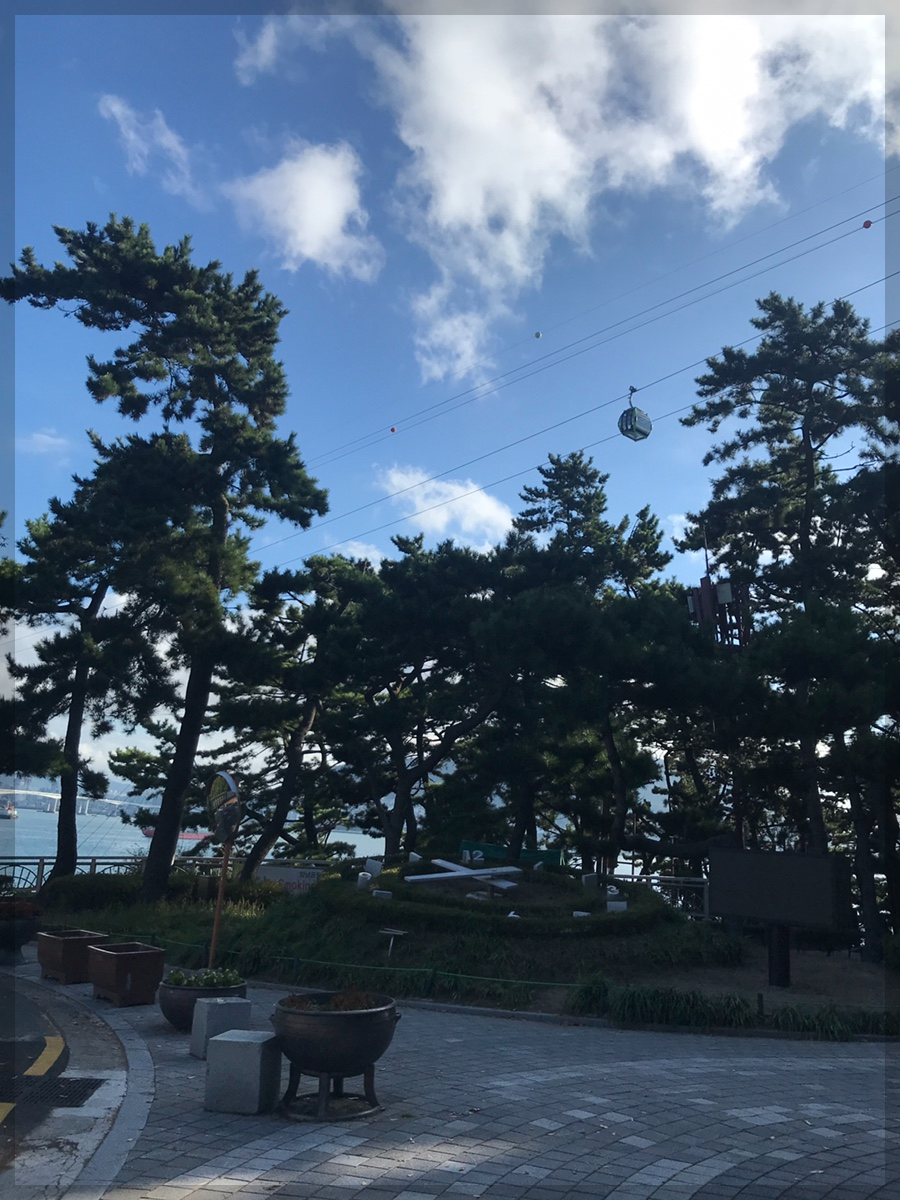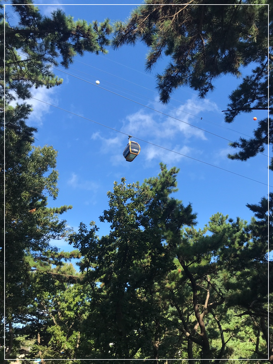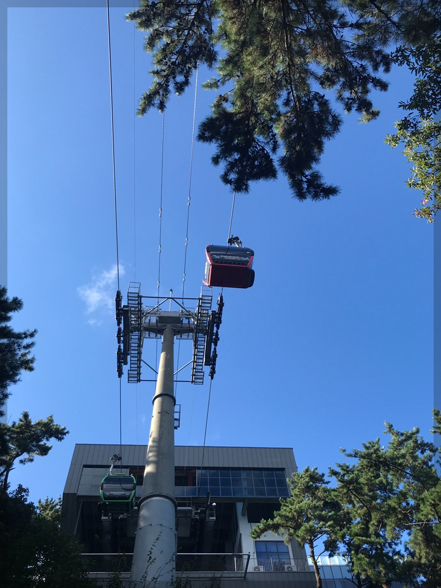 입장시간을 기다리는 동안 큰딸은 부산에서 도킹을 시도하려는 한국에 들어와서 영어강사로 일하는 미국인 친구(?)와 통화하느라 딴 장소를 어슬렁거리고 저는 숲그늘에 몸을 숨겨 더위를 피하면서 하늘 위를 오가는 알록달록 케이블카 구경을 합니다. 바로 지근거리에 케이블카 승강장이 있는데 그곳 올라가는 것도 포기상태입니다.