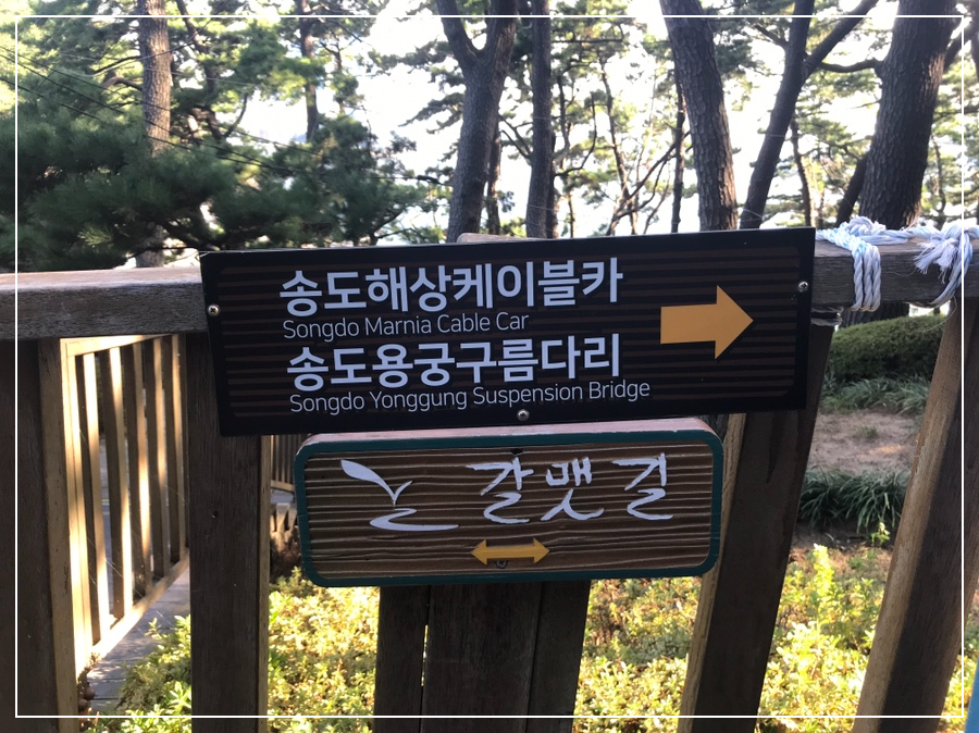 이정표에서 송도 용궁구름다리 방향으로 길을 찾아갑니다. 해상케이블카 선착장도 같은 방향입니다. 숲 사이로 드러나는 하늘가에 케이블카가 왔다리갔다리 하는 장면이 눈에 들어왔습니다. 케이블카 타는 것도 이곳 송도권역을 즐기는 좋은 선택지입니다. 저는 케이블카를 타도 더위를 피할 수 없으리라는 생각에서 그쪽으로 올라가지는 않았습니다.