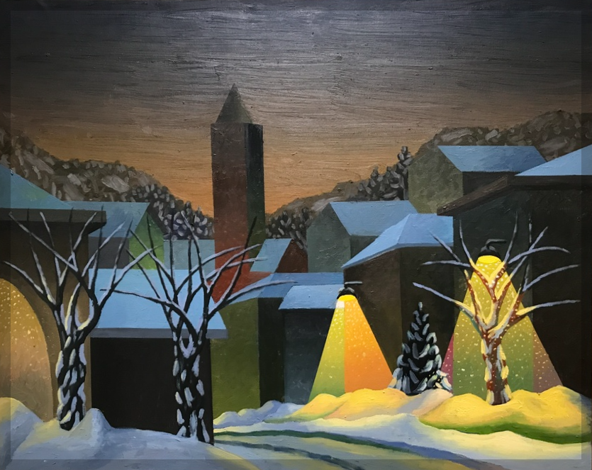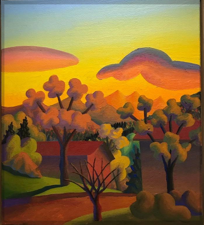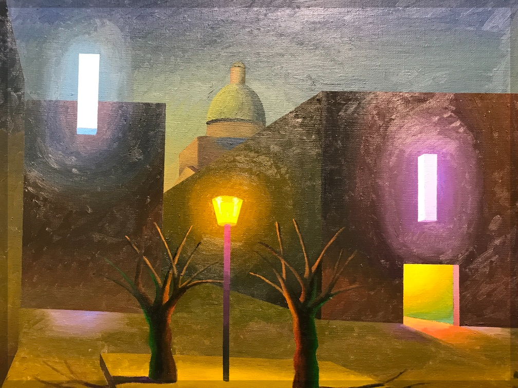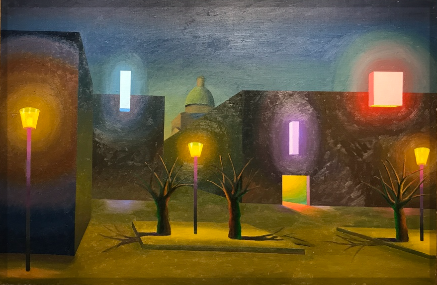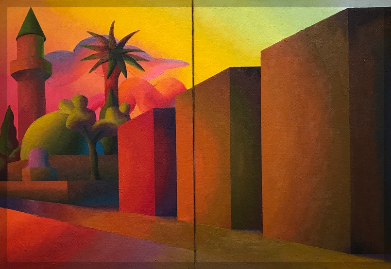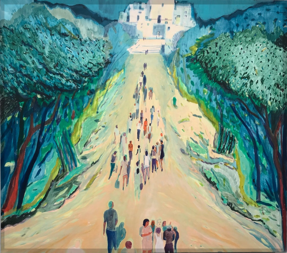 <도착과 출발>(2023)에서 길 양쪽으로 늘어선 나무들은 마치 푸른색, 녹색, 노란색의 풍성한 색조로 물든 그림자 속으로 사라지는 듯합니다. 이런 풍광을 이태리 베니스 여행 가서 베니스 비엔날레가 개최되었던 공원 인근을 거닐 때 느껴본 적이 있습니다. 그림 속에서 나무들은 추상화되어 몽환적인 분위기를 자아내는 회화적 붓놀림으로 녹아듭니다. 인물들은 건물을 향해 걸어가면서 점점 길어지고, 다시 나타났다 사라집니다. 모호한 배경은 작품 제목에 대한 의문을 제기하며, 눈앞에 펼쳐진 풍경은 상상의 시간과 공간에 뿌리를 둔 풍경으로 분화합니다.