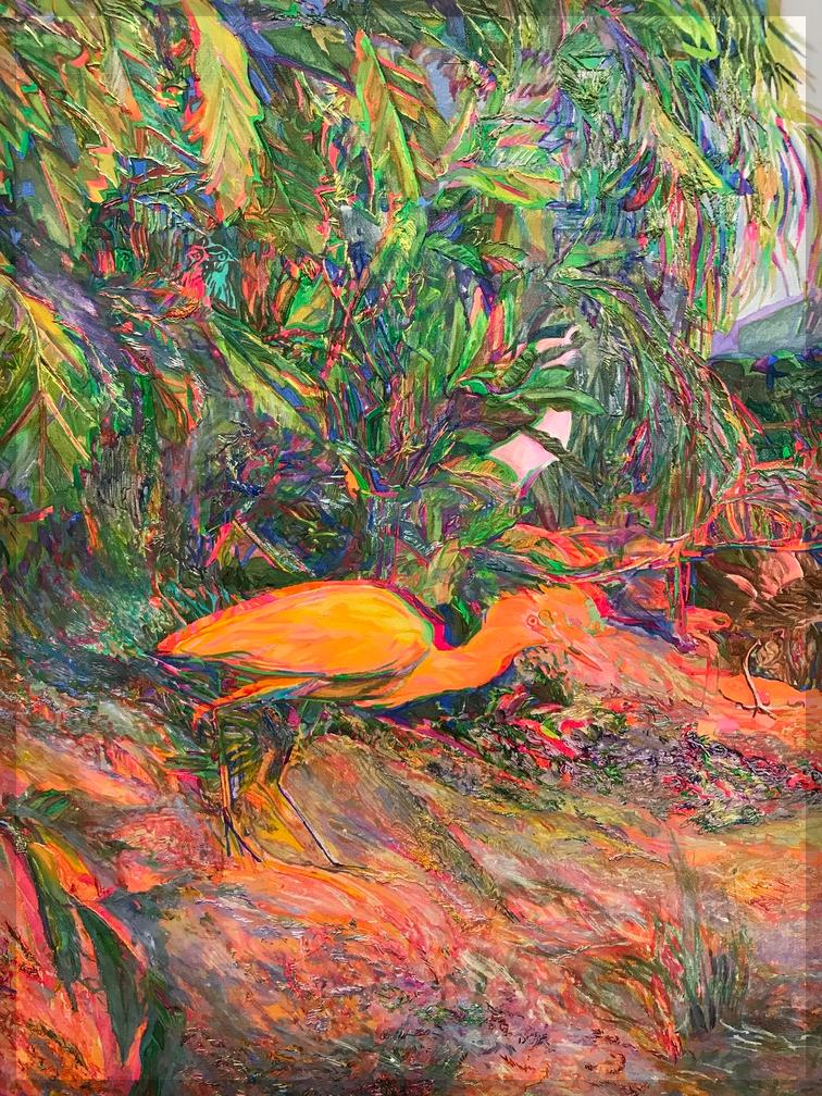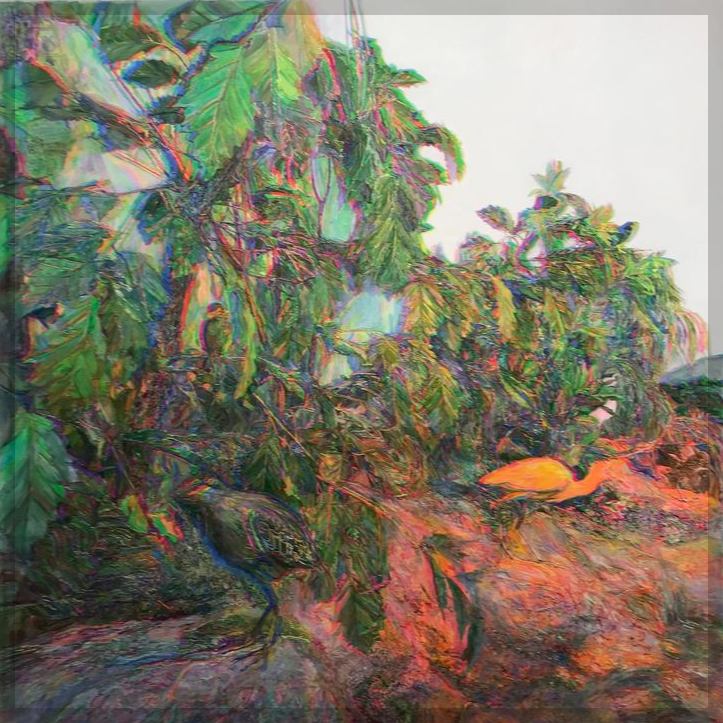 그녀는 캔버스라는 전통적인 회화의 조건과 그것을 넘어서기 위한 회화적 방식에 대한 실험을 지속해온 화가라고 합니다. 대상들을 RGB 컬러 스펙트럼으로 해체하고 다시 중첩해 그려낸 이미지 위에 형광색실로 자수를 놓음으로써 이미지와 색실 간의 또 다른 실재의 관계를 창조한다는데 이것은 유화작품이므로 관계없는 설명을 읽은 격이 되어버렸습니다.