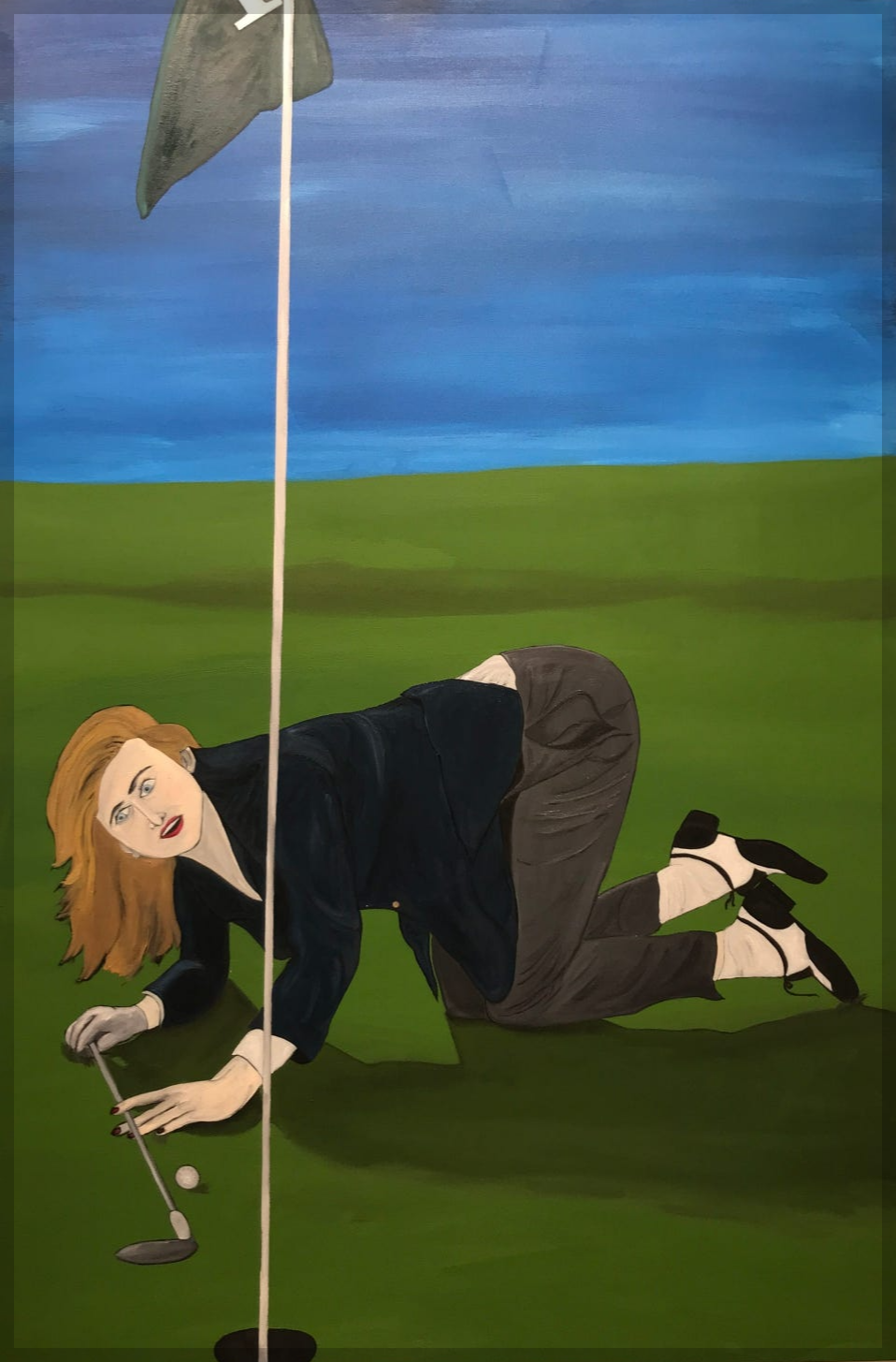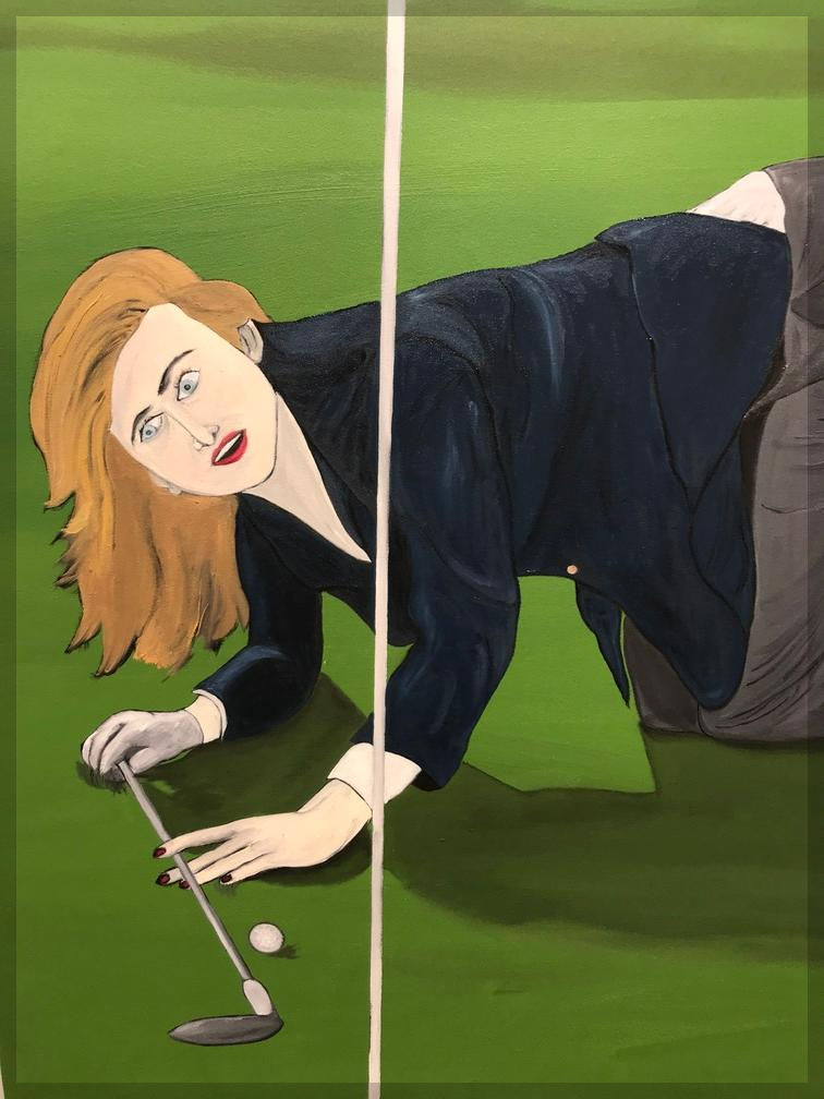 작품을 보면 홀에 꽂혀있는 막대기가 화면과 인물을 양분하고 있는 듯합니다. 인물의 상부는 공을 홀에 집어넣으려는 집중력으로 가득 차 있는 심경을 묘사하고 있으며 인물의 하부는 그런 욕망을 실현시키기 위한 토대를 구축하는데 아낌없는 헌신을 감당하고 있는 형국입니다.