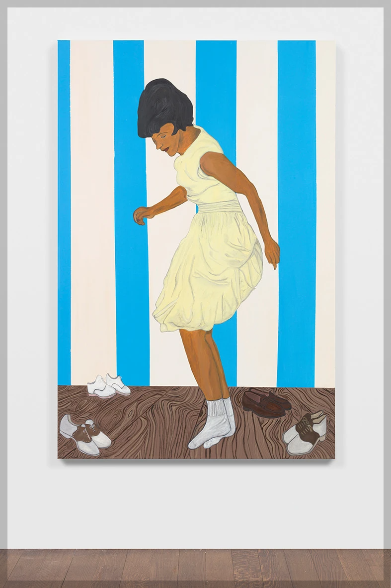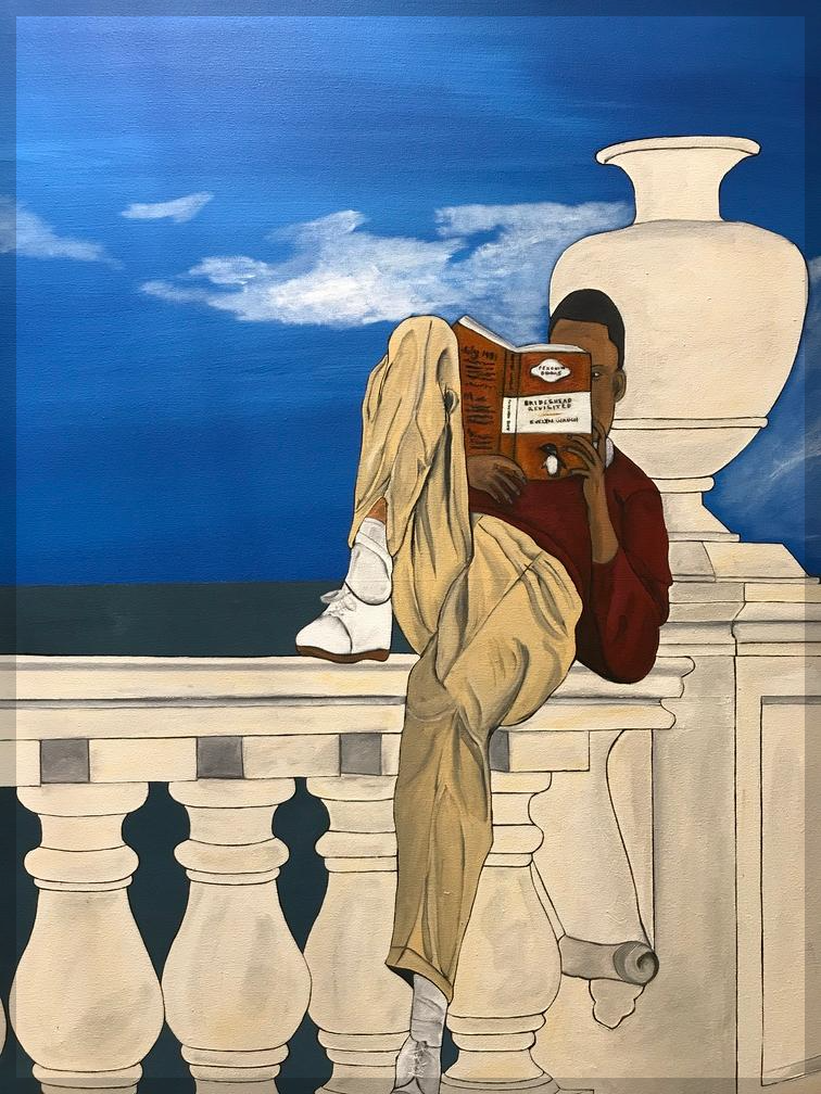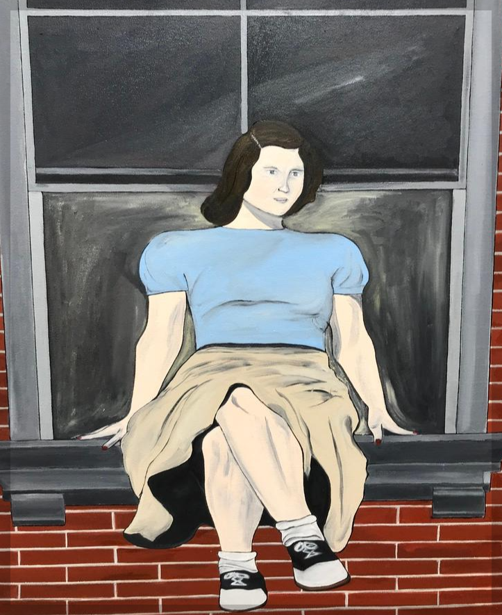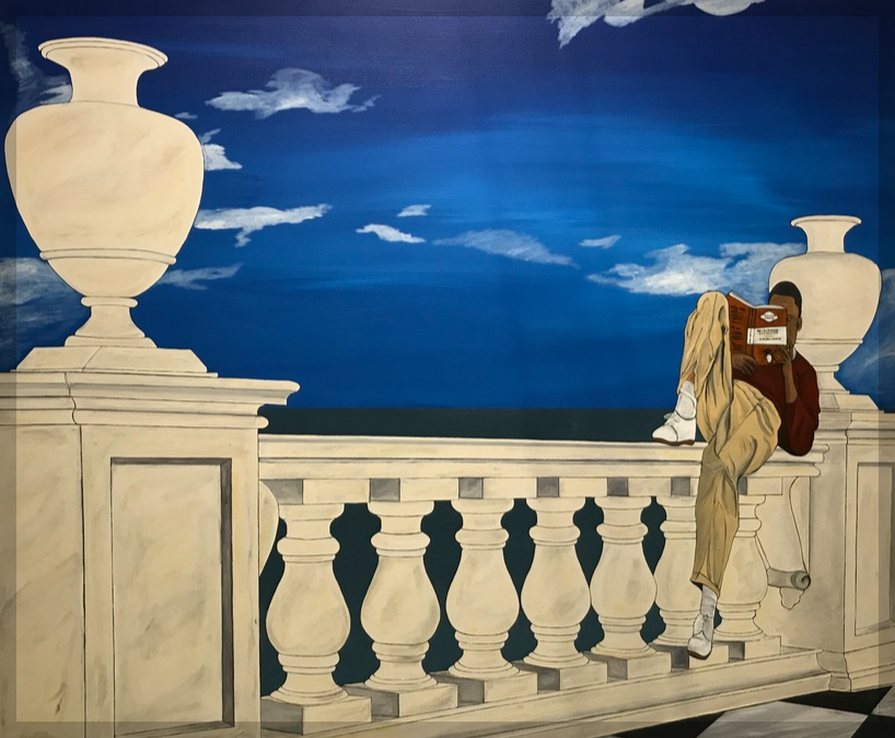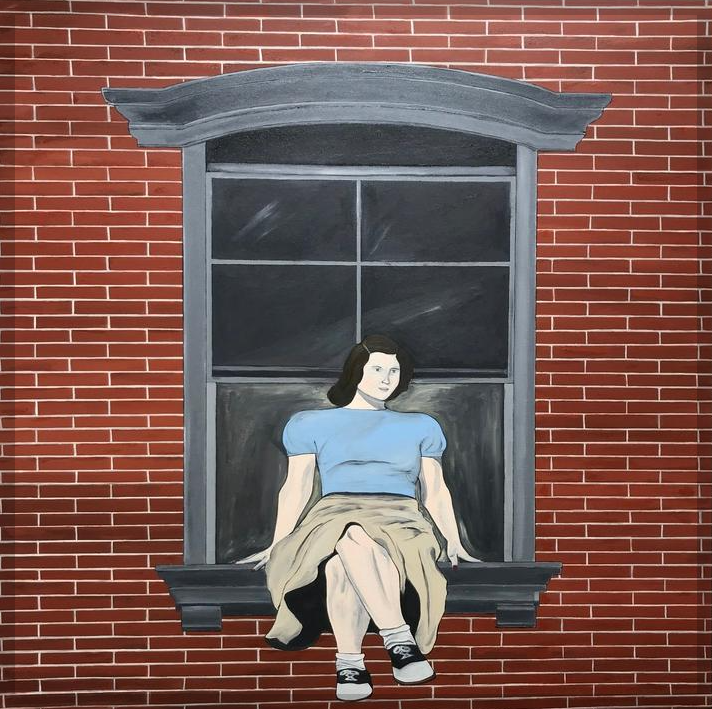 이 작품은 20세기 중반 남녀공학의 미학을 스타일링한 젊은 여성을 그렸습니다. 큰 벽돌 건물의 창틀에 천연덕스럽게 앉아서 햇볕을 쬐고 있는 여학생! 추정컨대 저 여성은 땅에서 떠 있는 위치에 포지션을 잡고 있으므로 추락의 위험을 감수하고 있음이 분명해 보입니다. 아래에 있는 위험이나 혹은 럭비 선수와 장난치는 상황이지만 아마도 그녀는 자신의 안전성을 신뢰하고 있는 듯합니다. 타이터스는 이처럼 세련되고 미묘한 그림에서 아름다움, 힘, 부족, 욕망에 대한 명상을 제공합니다.