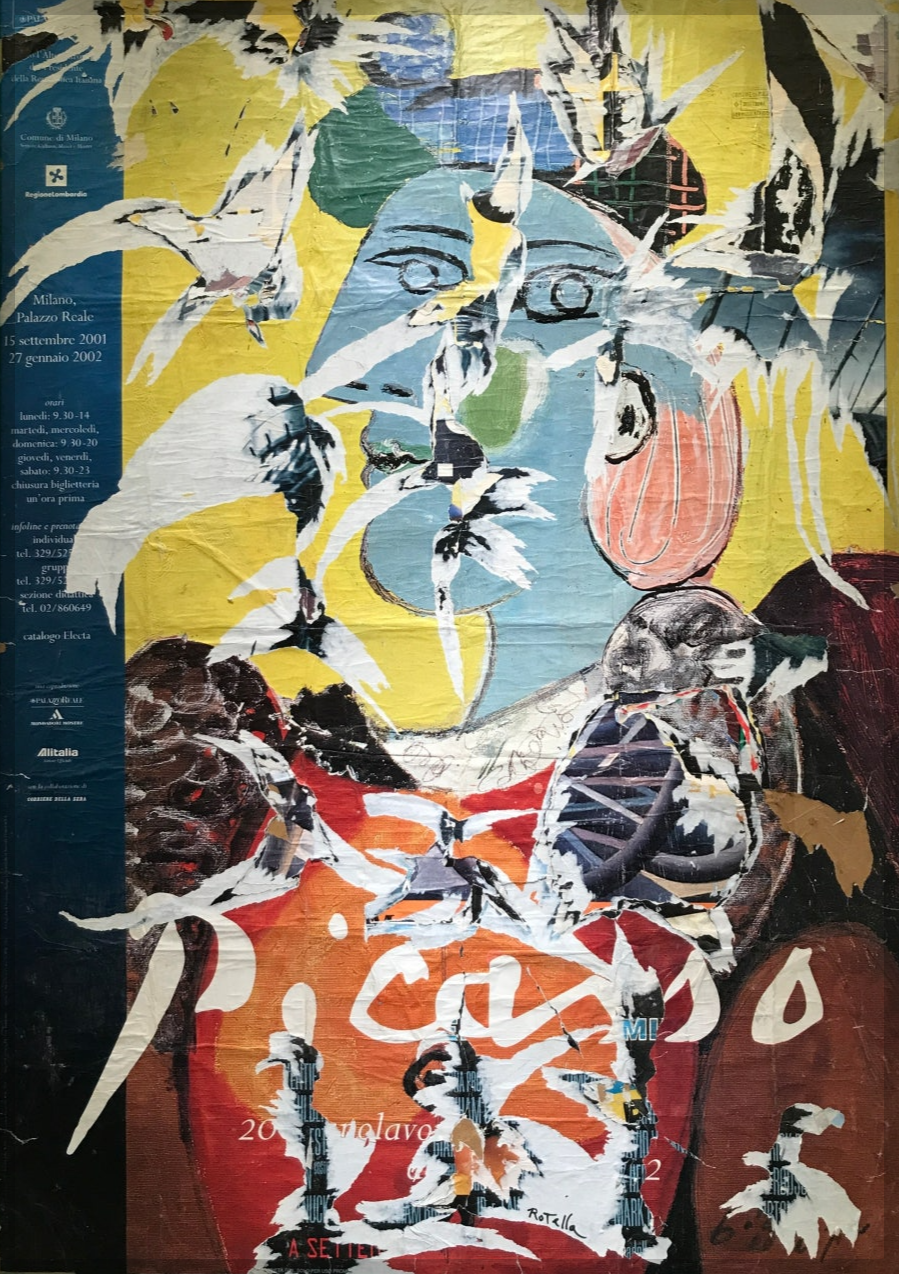 <Picasso Lacerato(2001)>는 끊임없이 혁신을 추구하는 Mimmo Rotella(미모 로텔라)의 선구적인 데콜라주 기법이 사용된 작품입니다. Rotella는 이탈리아 전후 예술의 최전선에 서서 새로운 실험적 실천을 위해 회화를 재빨리 포기하고 캔버스 조각과 도시 성벽에서 찢어낸 광고 포스터 조각을 붙여 데콜라주를 제작했던 아티스트였습니다.