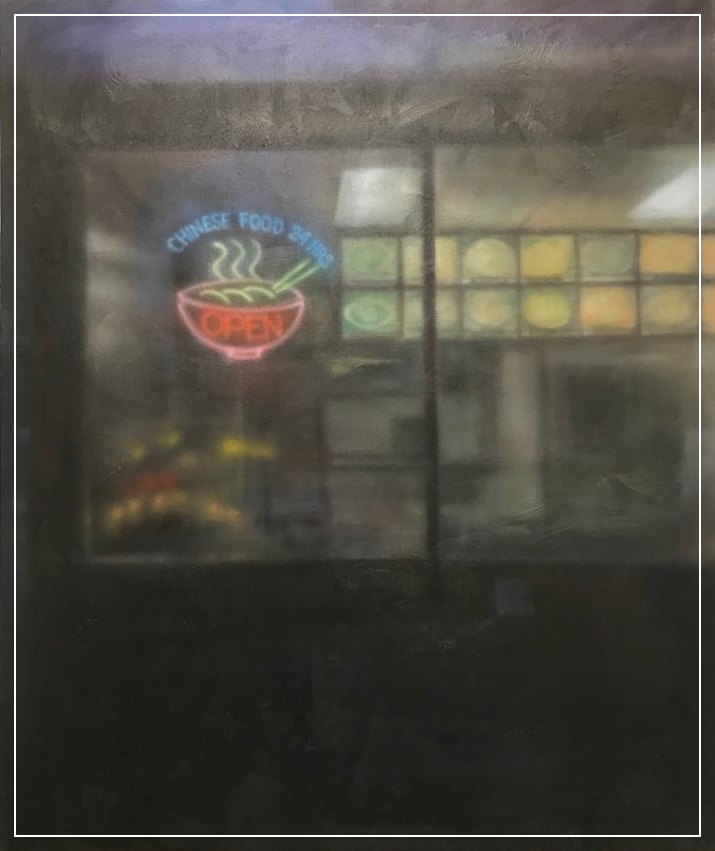 작품 <유행(In fashion)>은 진홍색 정장을 입은 1940년대 중국계(?) 여성모델이 Runway를 걷고 있는 장면을 담았습니다. 인민복 패션인 것으로 보아서 아마도 공산주의 사회의 여성인물로 비칩니다. 그(공산주의) 컨셉에 맞춘 것일까요? 패션쇼 런웨이를 걷는 그녀는 차갑게 앞을 바라보고 있으며, 세련되지만 뚫을 수 없는 엄정한 군기(?)가 잡혀있는 느낌이 전달되어 옵니다. 그녀의 그림자는 바로 너머 몇 인치 떨어진 부르고뉴 벽(the burgundy wall)에 드리워져 있고, 작품 왼쪽 아래 모서리에는 모호하지만 위협적이라고 인식할 수 있는 드레스 슈즈가 포지션을 점령하고 있습니다. 모델이 있으니 당연히 바라보는 구경꾼들이 바글거릴 것입니다.