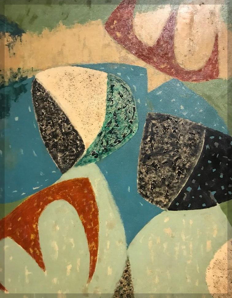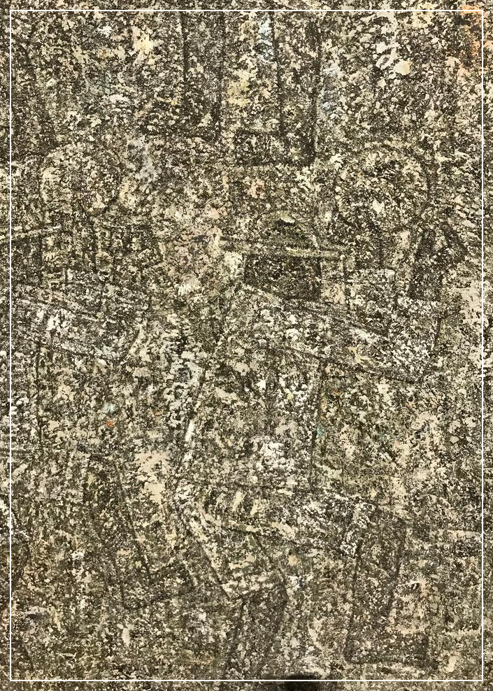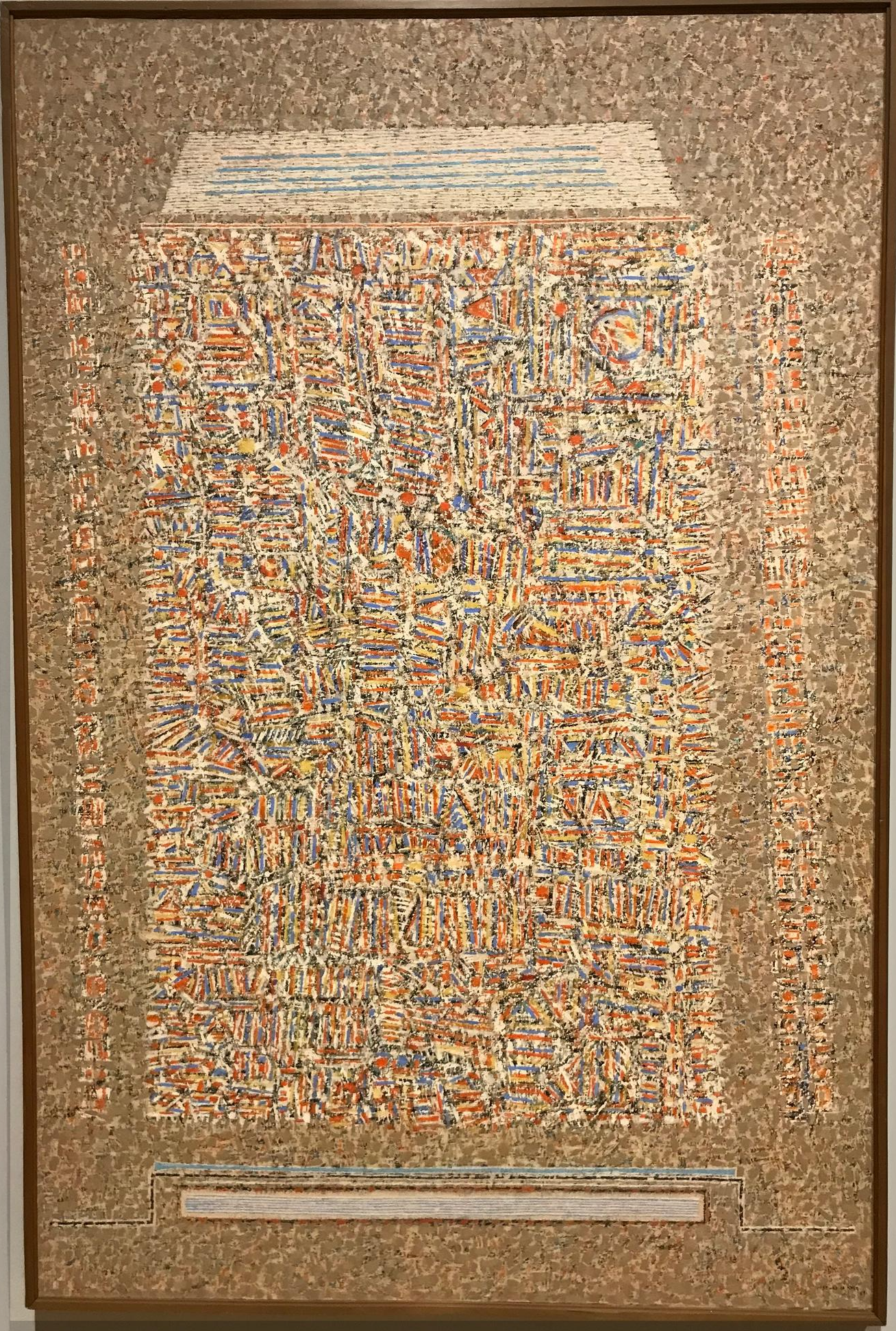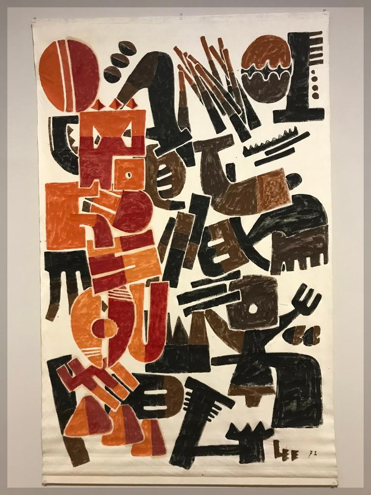 작가는 문자추상을 하면서 다양한 조형적 실험을 한 것으로 보입니다. 세라믹, 타피스트리 등의 영역 확장뿐 아니라 평면 작품에서도 종이에 채색이 아닌 꼴라주, 천 등 재료에 변화와 실험을 시도한 결과를 살펴볼 수 있었습니다. 하지만 그림 속 문자가 무슨 글자인지 정확하지는 않습니다.