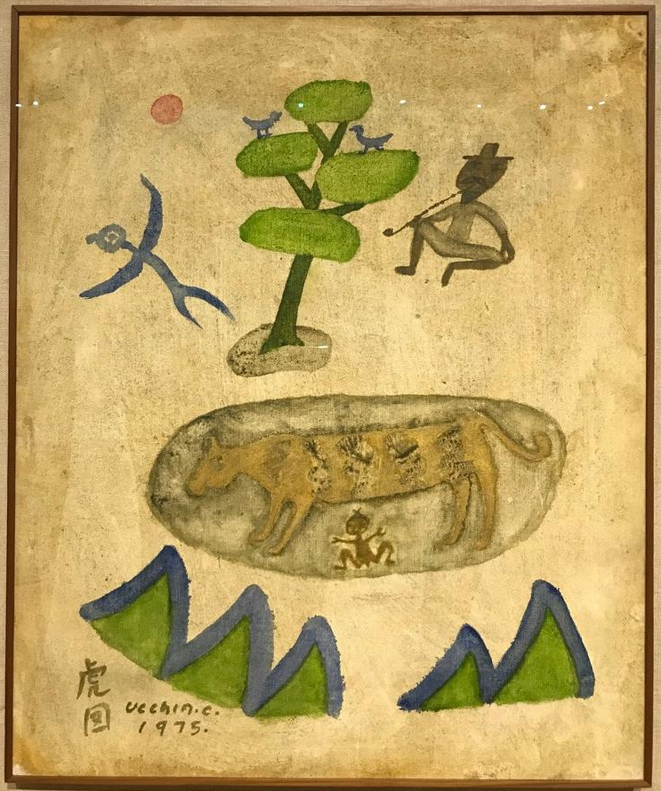 평론가들의 해설에 따르면 나무, 집, 새, 아이, 가축 등과 같은 소재를 일상생활과 연결지은 장욱진의 작품에서 다소 예외적인 것이 있다면 여기 소개된 것과 같은 불교적인 색채와 민화적인 이야기를 바탕으로 한 작품을 제시하게 됩니다. 위 작품 <호도(虎圖)>는 아이와 연관된 민화적 서사를 담고 있는 작품으로 보입니다.
