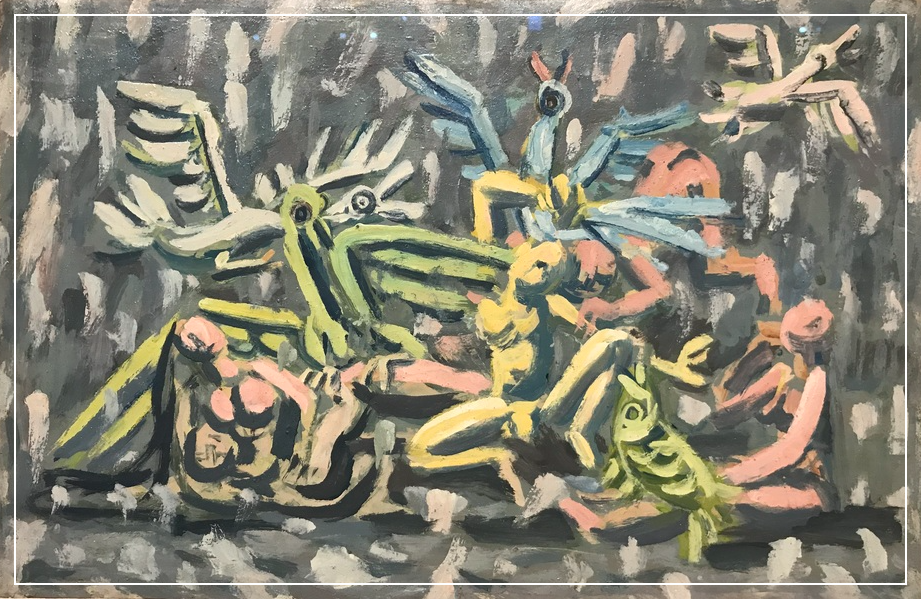 <가족과 첫눈>은 함경남도 원산에서 한국전쟁 중 갑작스럽게 피난(아마도 1.4 후퇴?) 내려온 이중섭이 제주도에 정착한 이후에 제작한 작품으로 보입니다. 남녀노소 사람들이 자신들 몸보다 더 큰 새와 물고기 사이에서 함께 첫눈을 맞으며 뒹굴고 있는 모습을 담았습니다. 이처럼 현실 세계와 다른 '크기'는 작품을 '초현실적'으로 보이게 하는 요소라고 설명합니다. 누가요? 평론가들 혹은 큐레이터들이겠죠. 실제로 이중섭은 일본 유학시절 인간과 동물이 어우러진 초현실주의 경향의 작품을 다수 제작했었던 이력이 있었습니다. 그렇다면 거의 미술을 하기 시작한 처음단계부터 보여주었던 내력이라는 거군요. 그림을 그리면서 새로운 모색으로 창안해 낸 것이라면 더 의미 있었겠는데.