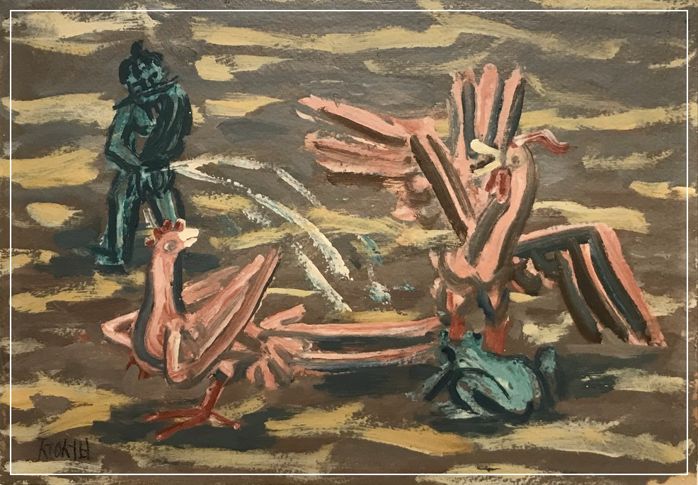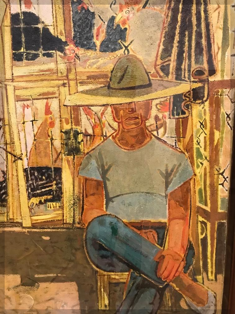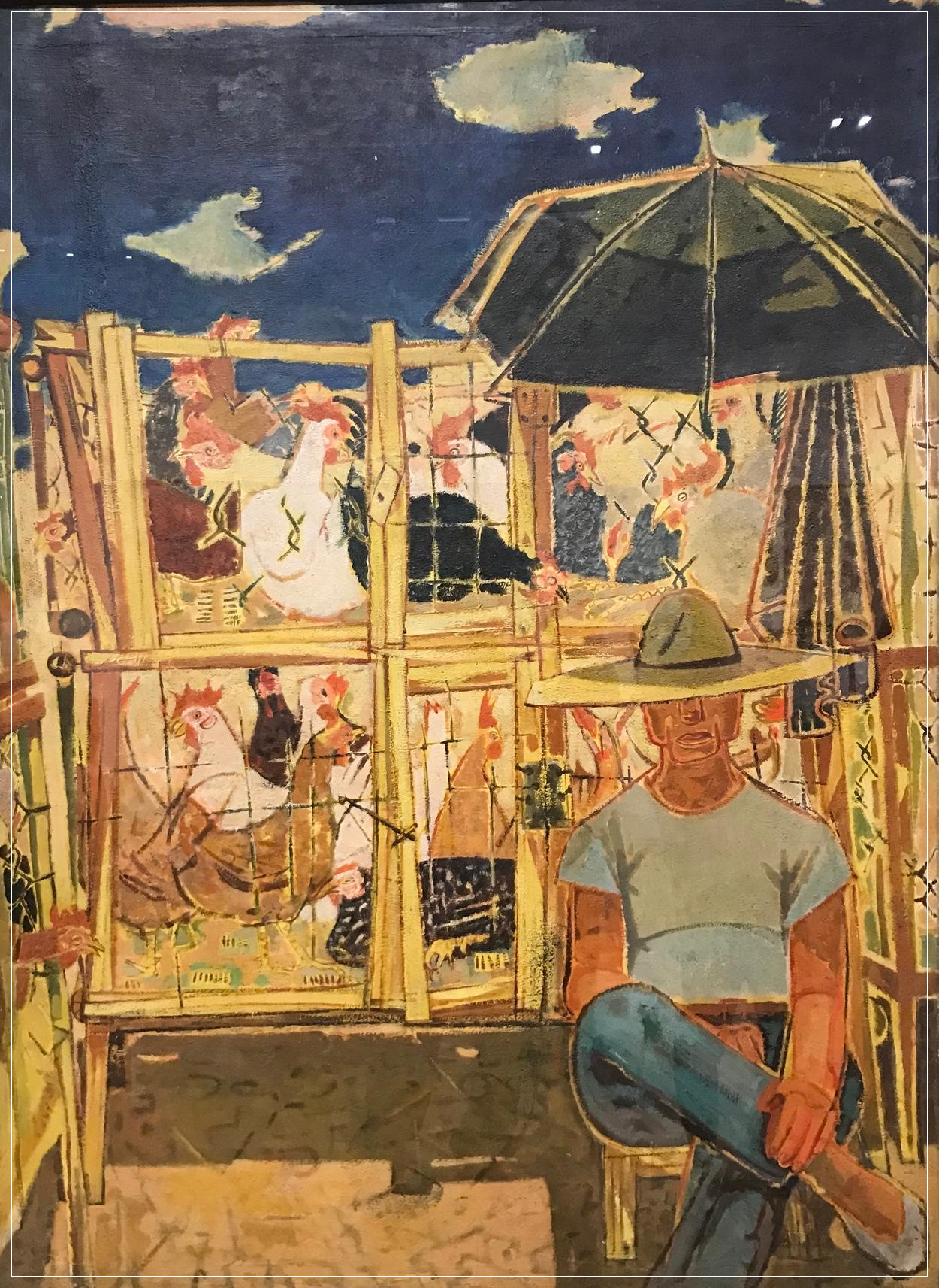 이름만 알고 있었던 아티스트 문신은 '시메트리(Symmetry)' 즉, 좌우균제 구조의 개성적인 조각을 하는 작가로 유명하지만, 회화에서도 뛰어난 기량을 보여주었습니다. <닭장>은 문신이 국내 화단에서 활동하던 시기의 작품으로, 모자를 눌러쓰고 한 여름 닭장 앞에 앉은 인물을 통해 답답하고 혼란한 당시 현실을 반영하는 듯합니다.